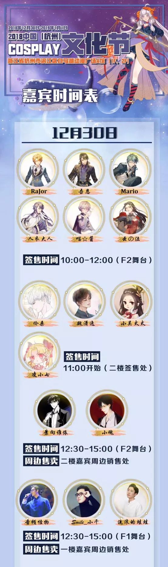 倒计时3天!2018中国(杭州)Cosplay文化节#游场地图、活动指南统统看这里! 2018年12月28日 11:09:08 星期五 嘉宾签售安排,自由舞台安排,场地&交通线路图,自由行名单,Lolita嘉年华~~欢迎小伙伴们元旦一起来现场和小编偶遇~~现场会设有官方售票处,同时也可以在喵特及B站上购买电子票哦!跨年就来杭州白马湖! 不多说了!看图吧!嘉宾签售安排#自由舞台安排#场地&交通线路图#自由行名单#Lolita嘉年华# 作者:小年糕 编辑:赵婷