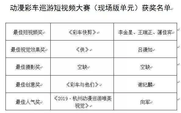 彩车巡游首届短视频大赛结果出炉 经过紧张激烈的初评、网络投票、终评首届短视频大赛结果已经新鲜出炉啦~本次大赛有近百名选手报名参加,长枪短炮聚集现场,颇为壮观。经过评选,共有31件作品入围网络展播投票。参与评审的评委们表示“参赛作品创作用心、充满创意、画面讲究”短视频大赛给予大众一次参与分享表达自我的机会一次多角度展示彩车巡游精彩度的平台最后,经过评委们的激烈讨论确定了首届彩车巡游短视频大赛的获奖名单恭喜获奖团队期待明年更精彩的作品! 2019年09月11日