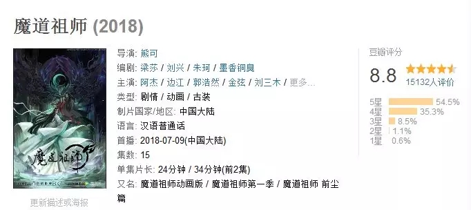 在动漫节上,《魔道祖师》动画声优阿杰、郭浩然悉数亮相分享创作趣事,上演花式配音,现场人气爆棚,《魔道祖师》的火热可见一斑。 高水准古风国漫开局强势领头 不负一年等待,《魔道祖师》动画第一季“前尘篇”动画自7月9日在腾讯视频独家上线,就惊艳了观众的眼球,上线十五分钟就有2.6亿播放量。目前,动画已更新5集,豆瓣评分也高达8.8分, #魔道祖师动画#微博话题阅读量高达6.4亿,话题讨论超过125万,从80后到10后,都在疯狂追看,热度空前高涨。