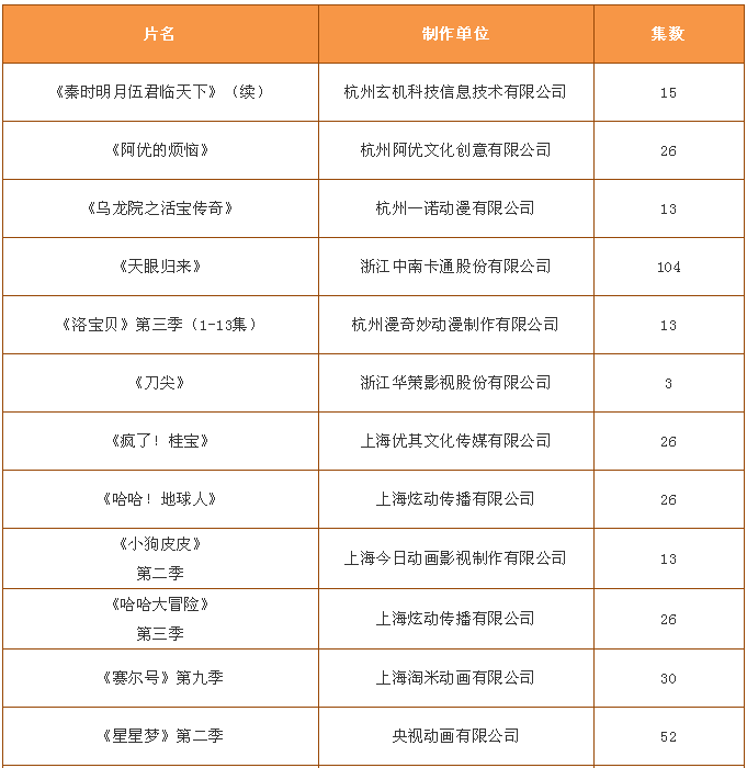 | 近日,国家广电总局发布了《国家广播电视总局关于推荐2018年第二季度优秀国产电视动画片的通知》,确定《星星梦(第二季)》等11部国产电视动画片为2018年第二季度推荐播出优秀片目。在这11部国产动画中,有3部作品来自杭州,推优作品数量为全国第一。 而今年第一季度的12部全国推优作品中,也有3部作品来自杭州。2018年上半年,杭产动漫用6部精品成为全国推优作品最多的城市,用实力打造了杭州动漫之都的金品牌。 今年上半年,杭州动漫游戏产业也展现了强劲的实力。这些数据,你知道吗?截至6月底,杭州市动漫游戏企业生产动画系列片551集7293分钟,动画电影6部,漫画作品73部发行212万册,开发游戏产品300余款,实现产值188.82亿元,动漫产值1.24亿元,上缴税金20.68亿元,较去年同期稳中有升。 下面跟着国漫君来看看,2018年上半年,分别是哪六部杭州作品获得推优吧! 《秦时明月伍君临天下》续 杭州玄机科技信息技术有限公司 《秦时明月之君临天下》(续)是由沈乐平执导,杭州玄机科技信息技术有限公司出品的3D武侠动画《秦时明月》的系列作品。
