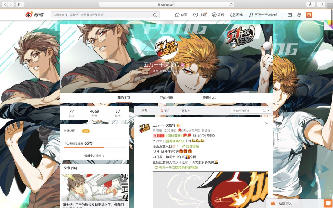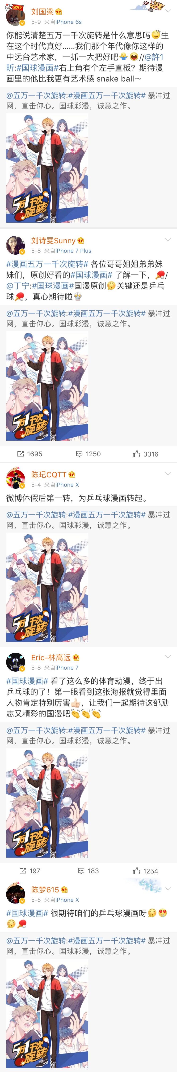 官方微博截图 漫画《五万一千次旋转》的微博官宣人物群像海报后,迅速引发漫迷和球迷热议,当天海报点击量就过300万,马龙、许昕、樊振东、丁宁、刘诗雯等国家队球员也纷纷转发,甚至“惊动”了那个“不懂球的胖子”刘国梁,在微博询问:这标题什么意思?