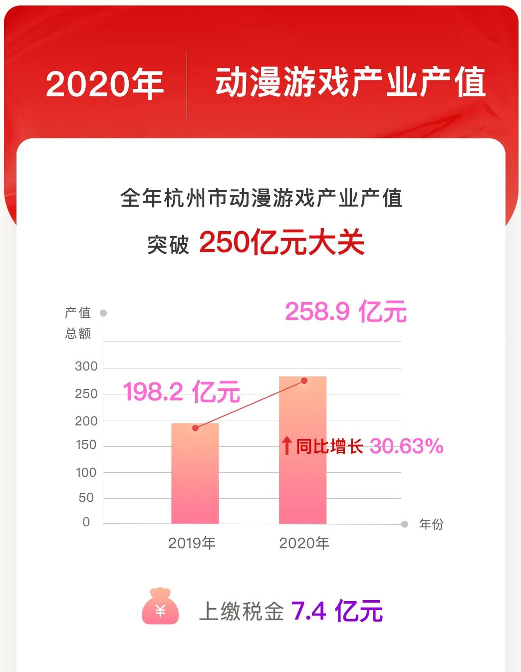 2020年,杭州动漫游戏企业凝心聚力、攻坚克难,在逆境下寻求突破,脚踏实地、拼搏奋斗,取得了社会效益和经济效益双丰收。 据统计,2020年全年杭州市动漫游戏产值达到258.9亿元,比2019年增长30.63%;上缴税金7.4亿元。