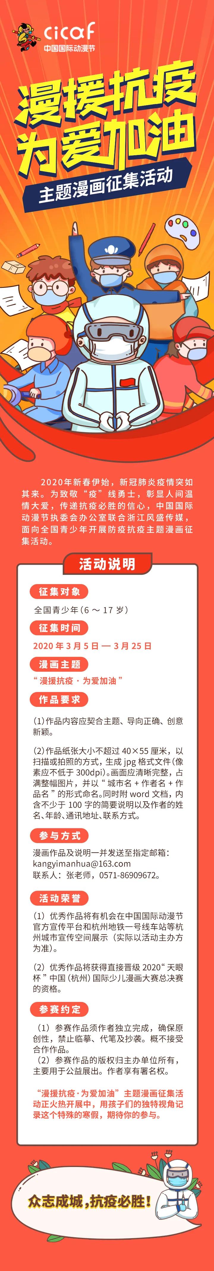 | “漫援抗疫·为爱加油” 主题漫画征集 新年伊始, 新型冠状病毒肺炎疫情席卷全国。 守望相助,共战疫情。 杭州动漫游戏人纷纷以笔为戎, 积极创作动漫作品科普防疫、慰藉人心。 那么,对于广大青少年来说, 这场无硝烟的“战疫”代表着什么? 奔赴一线的白衣天使们是怎样的形象? 对于战胜疫情有怎样的期许和祝福?