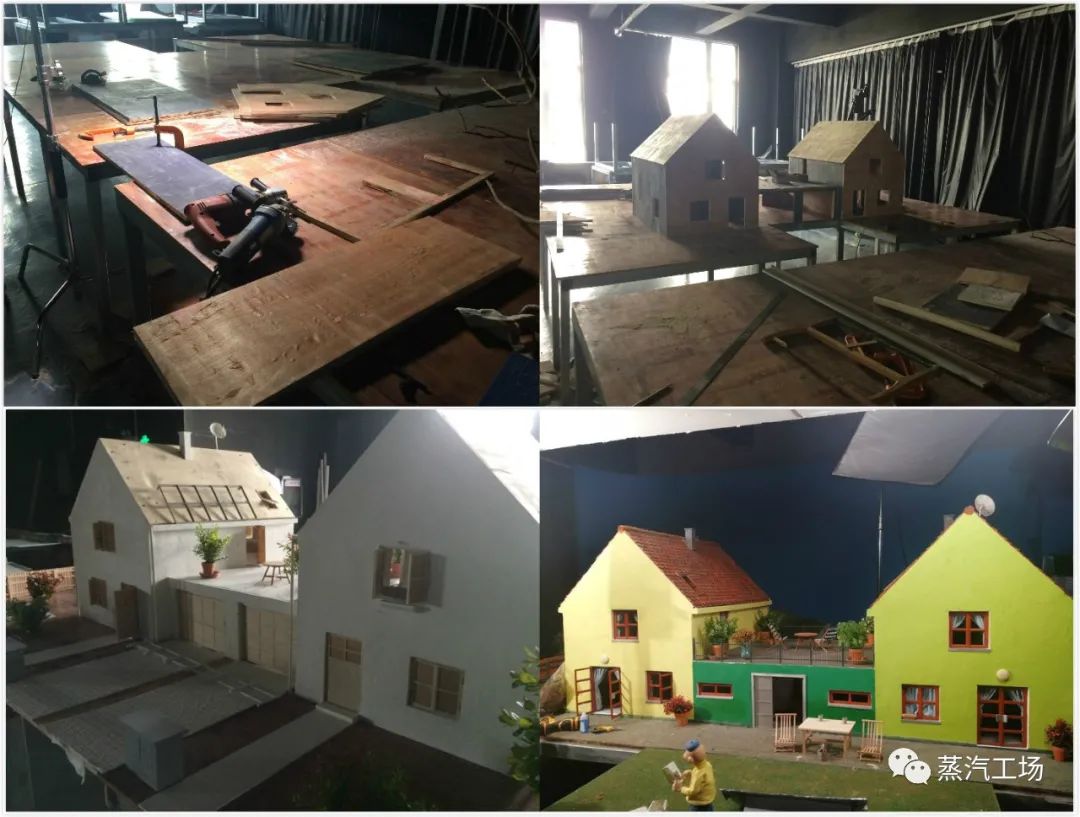 ▲“连栋小别墅”制作过程:木板搭建主体-制作窗户围栏及房子周围的马路-刷腻子粉铺平墙面-刷油漆,贴上瓦片。