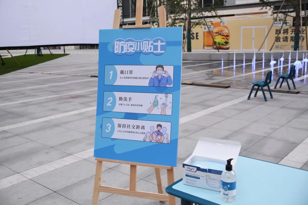 在准备放映工作的同时,活动举办方也开始了场地布置工作,不仅有序放置了一些小椅子,还贴心地在显眼位置树立了“防疫小贴士”牌,并准备了口罩、免洗洗手液等防疫物资。