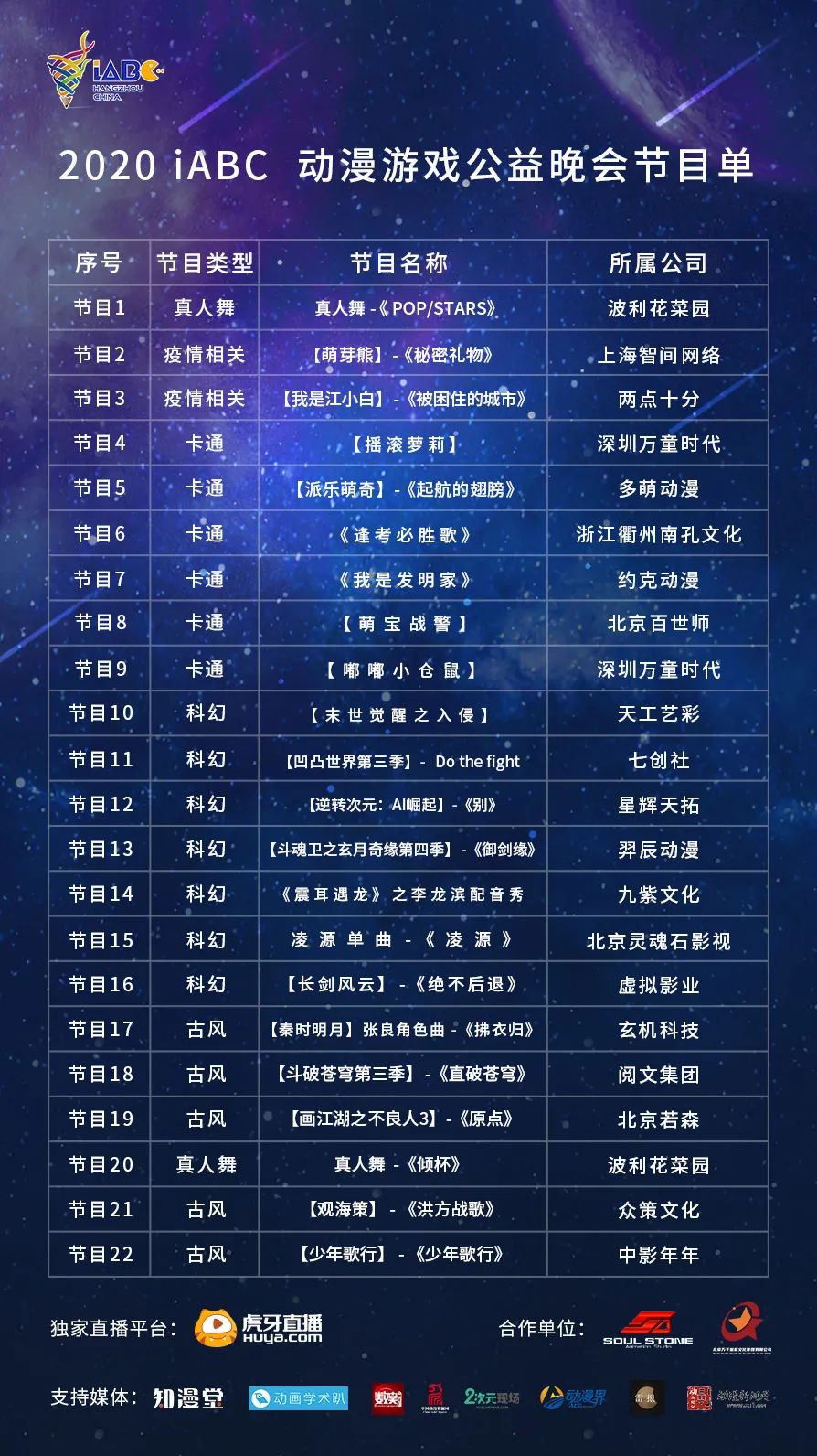 在五月份发布“互联互动 漫爱无疆”2020iABC动漫游戏公益演出节目征集后,四个月的时间里收到来自行业的各方投稿,最终从数百项节目内容中选出了22个来到iABC的活动现场。以最擅长的方式传递时间,传递爱,展现国漫新形态。 “互联互动 漫爱无疆” 2020iABC动漫游戏公益演出节目名单