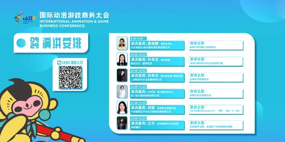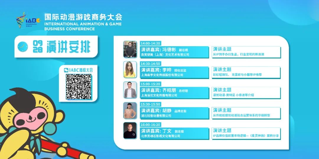 | 2020国际动漫游戏商务大会(iABC)IP授权合作大会,定于9月28日下午和29日上午在杭州萧山区第一世界大酒店宋城厅举办,欢迎关注IP授权的朋友来现场与行业代表进行面对面交流洽谈! 9月28日下午,知名手办厂商良笑塑美、知名IP形象彩虹轻骑队、初音未来、假面骑士、奥特曼等将参会分享;9月29日上午,创作了知名抗疫漫画“加油热干面”系列,并拥有“乖巧宝宝”“发射小人”等中国表情社交IP的萌力星球,和拥有丰富授权合作经验并拥有成熟IP变现渠道的优贝爱必玩也将参与大会与大家进行交流分享! 本次授权大会还将特设IP超市,超过400个国内外知名动漫游戏IP汇聚一堂,现场可自助查询沟通,创造更多商机!