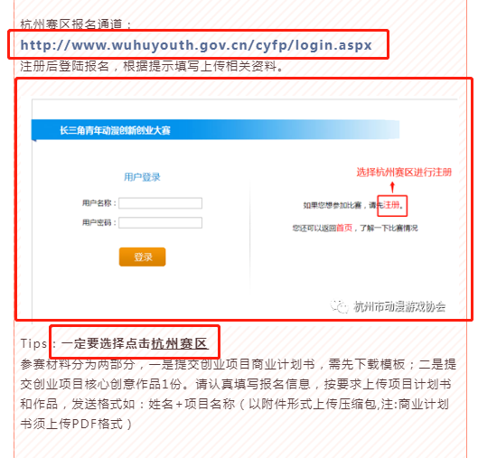 | 搭建服务动漫产业青年创新创业平台, 发掘动漫产业青年人才, 培育动漫产业创业项目, 助推长三角动漫产业蓬勃发展。 2020长三角青年动漫创新创业大赛·杭州赛区 作品征集启动啦! ▽▽▽ 参赛条件 1.参赛对象为动漫产业创业企业或创业团队,项目负责人需为45周岁以下(含)具有完全民事行为能力的创业青年,团队成员不超过3人,且需涵盖企业创始人或团队核心成员,市场、技术、运营、产品负责人。 2.参赛项目的作品、技术及相关专利归属参赛团队,与其他任何单位无产权纠纷。 3.参赛材料分为两部分,一是提交创业项目商业计划书,具体内容包括:项目名称、创业描述、项目概述及内容描述、市场预测、营销策略、融资与财务、风险规避、团队管理等;二是提交创业项目核心创意作品1份。 4.参赛项目应以提升能力、对接资本、整合资源、实现成长为目的。 赛事安排 (一)报名 参赛人员可登录大赛官方网站,根据网页提示要求完整、准确、真实地填报参赛相关信息。参赛项目原则上须根据大赛设置的分赛区就近选择报名参赛。 杭州赛区报名通道: http://www.wuhuyouth.gov.cn/cyfp/login.aspx