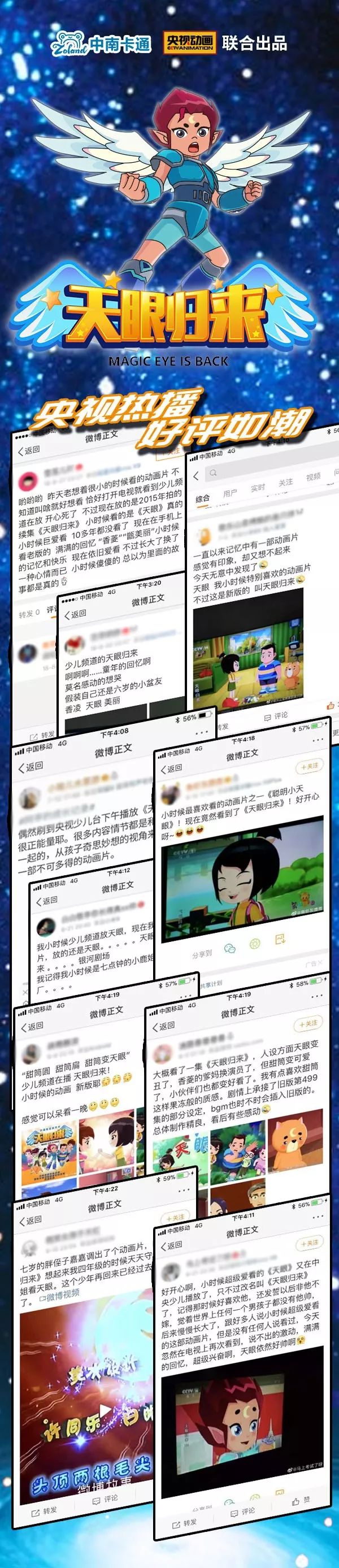 现在,《天眼》的延续之作《天眼归来》全新制作播出,依然传递给观众们满满的正能量,引导积极向上的人生观,学习正确的价值观,养成良好的行为习惯。《天眼归来》用动画的手段展现当代中国孩子丰富多彩、充满幻想的内心世界,捕捉日常生活中的点滴感动,彰显真善美,传递正能量。