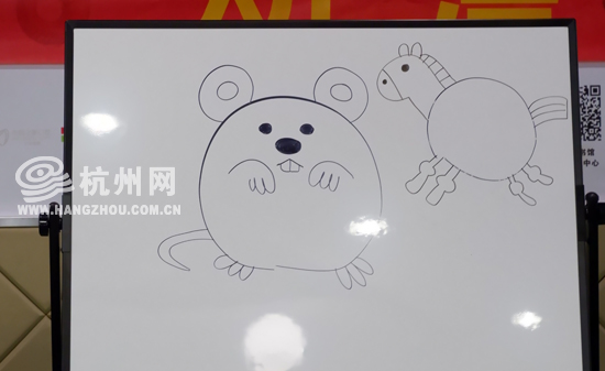 课堂上漫画家秒变幽默孩子王 分享“动漫魅力” 可能是漫画家本身就自带的“动漫”气质,“番叔老师”一出场就吸引了孩子的目光,很快和孩子们打成一片,马上就有小朋友自告奋勇上台与老师“PK”画技。课程就这么自然而然地在画生肖老鼠的PK大战中开始了。 之后的“你说我画”互动环节,更是达到了课堂气氛的高潮,十九番根据孩子们任意说出的形状和动物种类创作发挥,把一个简单的圆圈化成一匹奔跑中圆滚滚的“萌系骏马”;一个简单的三角形,三下五除二,就变成了一幅自带情节的“有鳄出没”图,语言幽默,自带漫画家特有的想象力,赢得了在场的大朋友和小朋友的阵阵掌声。