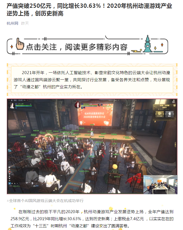 浙江新闻 《浙江新闻》网站2月8日发文《超250亿元 2020杭州动漫游戏产业产值创历史新高》。