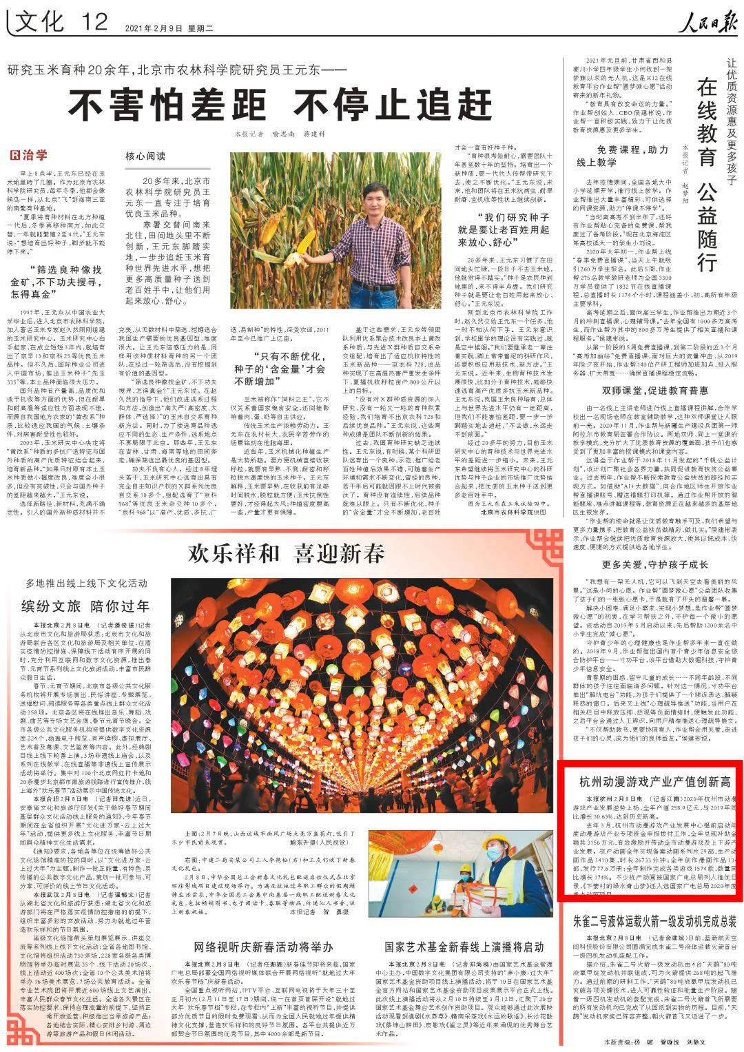 《人民日报》2月9日第12版刊出《杭州动漫游戏产业产值创新高》。