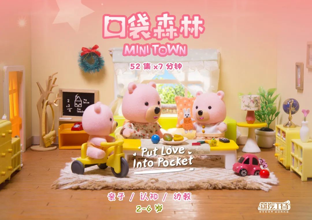 由杭州蒸汽工场文化创意有限公司制作的《口袋森林》,是一部以口袋熊为主角的长篇定格动画。故事讲述了口袋镇里口袋小熊们的成长故事,他们一起在小镇上快乐地成长,用它们的童趣探索着生活中“不可思议”的事。该作品还荣获第二十九届浙江省电视“牡丹奖”优秀动画片、2019年第二季度优秀国产电视动画片等荣誉。
