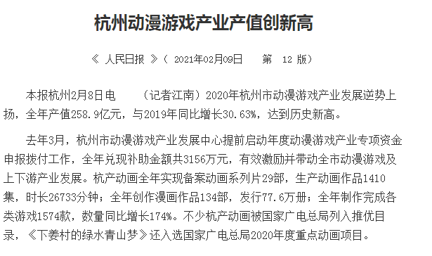 《人民日报》2月9日第12版刊出《杭州动漫游戏产业产值创新高》。
