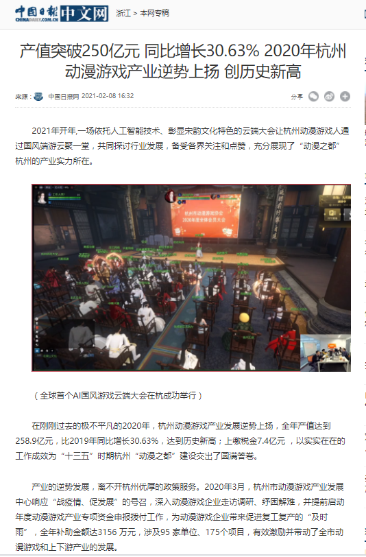 《新华社》客户端报道 中国日报 《中国日报》中文网2月8日刊文《产值突破250亿元 同比增长30.63% 2020年杭州动漫游戏产业逆势上扬 创历史新高》。