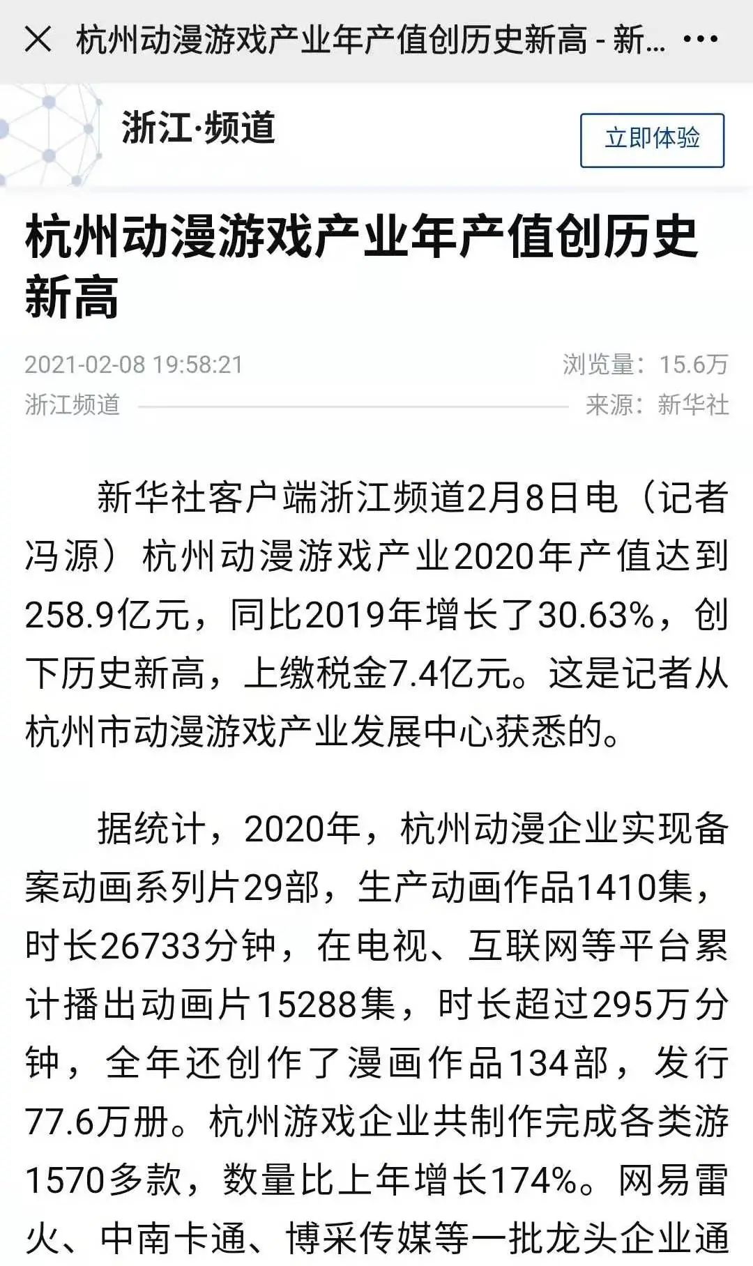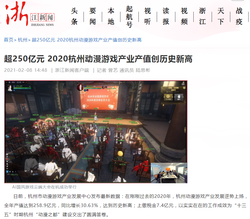 浙江新闻 《浙江新闻》网站2月8日发文《超250亿元 2020杭州动漫游戏产业产值创历史新高》。