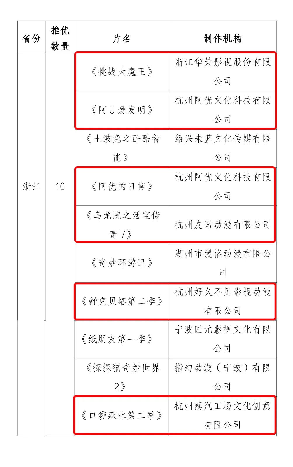 这6部杭产动画片分别是:浙江华策影视股份有限公司的《挑战大魔王》,杭州阿优文化科技有限公司的《阿U爱发明》《阿优的日常》,杭州友诺动漫有限公司的《乌龙院之活宝传奇7》,杭州好久不见影视动漫有限公司的《舒克贝塔》第二季,杭州蒸汽工场文化创意有限公司的《口袋森林》第二季。 入选广电总局推优的6部杭产动画片