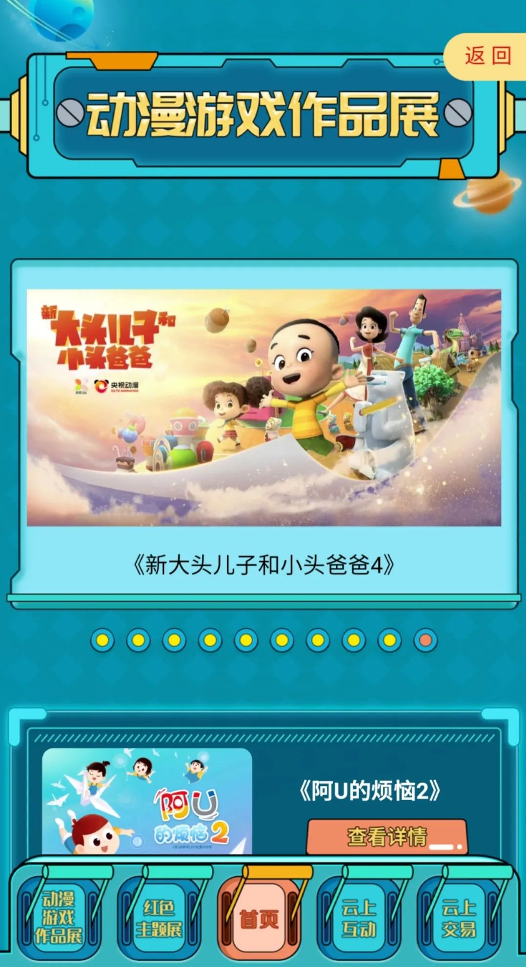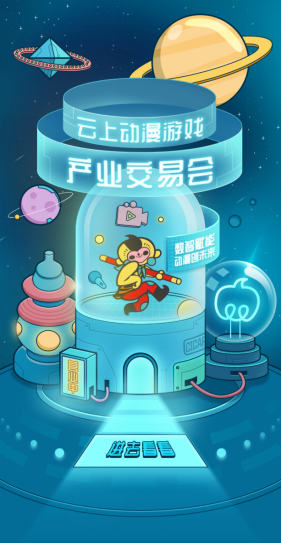 2021云上动漫游戏产业交易会网络平台界面 其中,云上虚拟展厅通过文字、海报、视频、外链等多种形式,以宇宙星空为背景、太空舱为操作界面,分漫画&动态漫画、动画&动画电影、游戏&衍生、VR&AR新技术四大板块,集纳包括央视动漫、腾讯视频、欧漫达高等100多个国内外动漫游戏企业的IP作品,体现动漫游戏行业发展全生态。