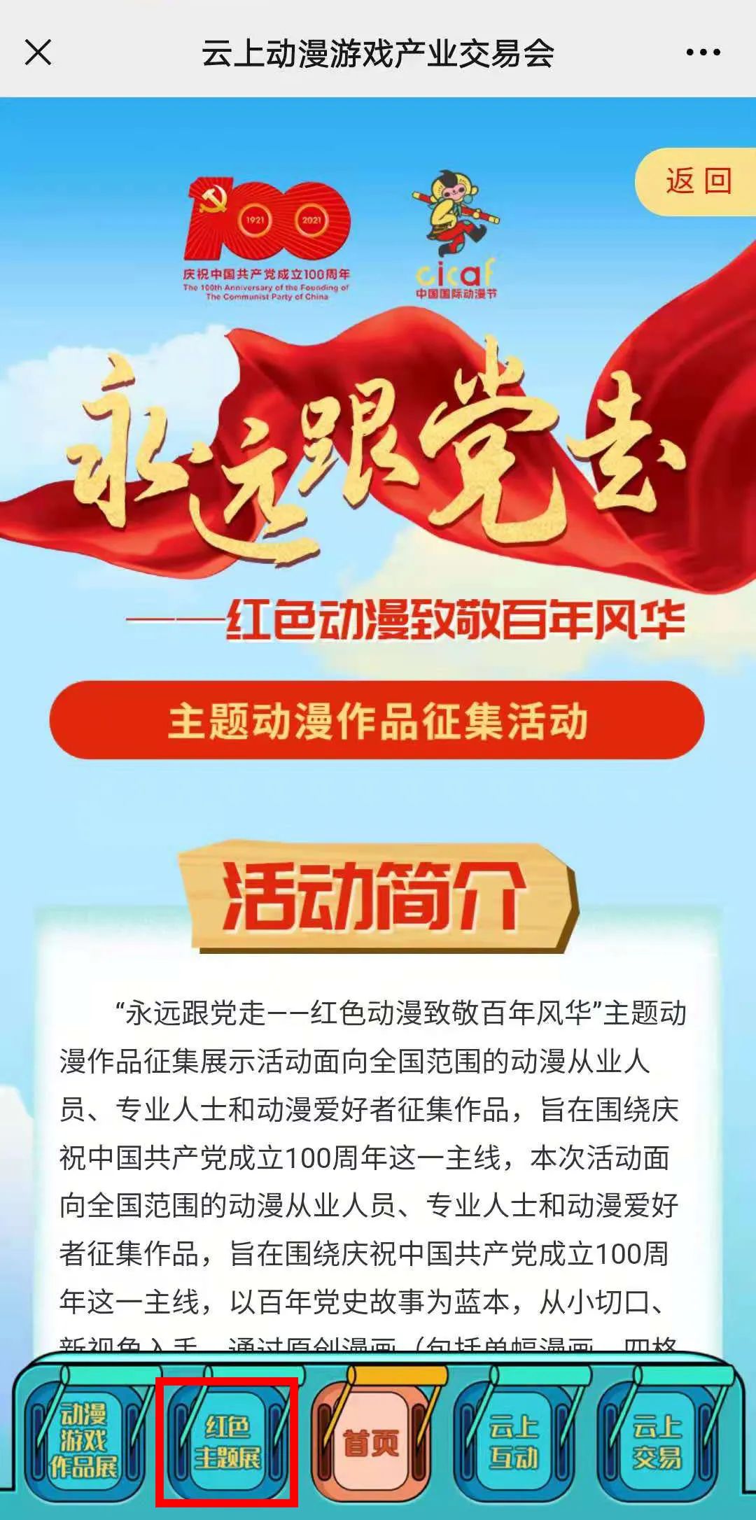 “永远跟党走——红色动漫致敬百年风华”主题动漫作品征集展示活动自4月初开展以来,陆续收到了来自全国各地的漫画、动画、表情包等作品。投稿者不仅限于浙江,更涵盖北京、上海、广东、江苏、四川、湖南、宁夏、山东、甘肃、黑龙江、新疆等多个城市和地区;既有个人,也有团体。 为了进一步发起征集邀约, 2021云上动漫游戏产业交易会也通过一站式、全天候网络平台的“云上展览”板块专门设置了“红色主题展”栏目,在征求作者同意的前提下,从已征集到的作品中遴选了25幅漫画作品进行预展示。即日起至5月5日,本微信公众号也将以“红色记忆”“党员本色”“感怀党恩”“红色传承”“奋进追梦”五个篇章,陆续展示部分征集作品,丰富人们假日文化生活的同时弘扬红色文化,营造庆祝中国共产党成立100周年的良好氛围。