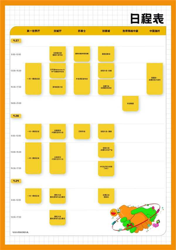部分资方 *更新至9月9日,还在持续更新中 *排名不分先后 ·北极光创投 ·真格基金 ·愉悦资本 ·腾讯创投 ·字节跳动 ·经纬中国 ·五源资本 ·东莞投资 ·桃李资本 ·东软资本 ·西州投资 ·创业邦资本 ·中科创达 ·微链 ·达晨资本 ·华创汇 ·乾道资本 ·先文资本 ·中科云富 ·达晨资本 ·科发资本 ·赛伯乐 ·新引力资本 ·动域资本 ·线性资本 ·海邦资本 ·文艺馥兴投资 ·越秀基金 ·天创资本 ·云久资本 1-1 商务洽谈【预约开启】 已完成证件注册的观众现在就可登录官网,进行预约。参会企业不断更新中,快向心仪的企业发起预约吧。 活动开始前也可登录官网,生成专属洽谈表,届时按照预约情况进行现场洽谈。 预约开放时间:即日起 — 9月26日 现场洽谈时间:9月27日 下午14:00 -17:00 9月28日 上午10:00-12:00 下午14:00 -17:00 9月29日 上午10:00 -12:00 洽谈地点:杭州第一世界大酒店 第一世界厅 第一步 进入iABC证件注册通道:http://iabc.cicaf.com/certificate/register 进行注册,完成参会人员填写及付费后,才可使用预约系统。 已完成注册的用户,可忽略此步骤! 第二步 在用户中心完善企业信息及个人信息,通过审核,可以帮助业内人士更好地了解您及您的企业和项目等内容。 *新用户需完善信息 *老用户可忽略此步骤 第三步 点击进入预约系统,每30分钟为一场洽谈。 *按时间发起预约:您可以选择心仪的时间段发起预约。点击发起预约后,可查看该时间段在现场的企业并选择一家意向企业发送预约申请。等待对方回复。在对方通过/拒绝后,你将收到提示邮件,请注意查看。 *按企业发起预约:出现企业名录,查看在场企业的时间表,然后发起预约。选择时间后,发送预约请求,等待对方回复。在对方通过/拒绝后,你将收到提示邮件,请注意查看。 2021iABC与会买家名录(部分) *更新至9月9日,持续更新中 云南广播电视台少儿频道 广东广播电视台 广东广播电视台嘉佳少儿频道 江西广播电视台少儿频道 武汉广播电视台 济南广播电视台电视少儿频道 江苏省广播电视总台(集团)优漫卡通卫视 重庆广播电视集团(总台)少儿频道 河北广播电视台少儿频道 宁波广播电视集团少儿频道 优酷 银河互联网电视有限公司 捷成华视网聚(常州)文化传媒有限公司 腾讯科技(北京)有限公司 北京奇艺世纪科技有限公司 北京悦响影视传媒有限公司 未来电视有限公司 深圳市路通网络技术有限公司 小米科技有限责任公司 金鹰卡通卫视 南京电视台 字节跳动网络科技有限公司 北京广播电视台卡酷少儿卫视频道 南京炫佳网络科技有限公司 上海森宇文化传媒股份有限公司 优扬传媒 卡秀动漫(深圳)有限责任公司 北京罗诗华夏文化发展有限公司 上海怿垚文化传播有限公司 深圳市时代科腾文化传媒有限公司 霍尔果斯麦濛影业有限公司 北京杰外动漫文化股份有限公司 万童时代文化(深圳)有限公司 广州市君临文化传播有限公司 北京酷虫影视文化传媒有限公司 抖音 广州艺捌传媒有限公司 广州艺洲人品牌管理股份有限公司 羚邦娱乐有限公司 北京普信文化传媒有限公司 上海朵漫文化传媒有限公司 香港中和天宜文化传媒有限公司 上海汇火文化传播有限公司 北京杰外云翎文化传媒有限公司 美太(芭比) 北京龙世天辰动画有限公司 易视腾科技股份有限公司 上海新创华文化发展有限公司 百视通网络电视技术发展有限责任公司 浙江中录文化传播有限公司 上海童雅文化传播有限公司 上海乐怿文化传播有限公司 北极光创投 真格基金 愉悦资本 腾讯创投 字节跳动 经纬中国 五源资本 东莞投资 桃李资本 东软资本 西州投资 创业邦资本 中科创达 微链 达晨资本 华创汇 乾道资本 先文资本 中科云富 达晨资本 科发资本 赛伯乐 新引力资本 动域资本 线性资本 海邦资本 文艺馥兴投资 越秀基金 天创资本 云久资本 iABC日程表