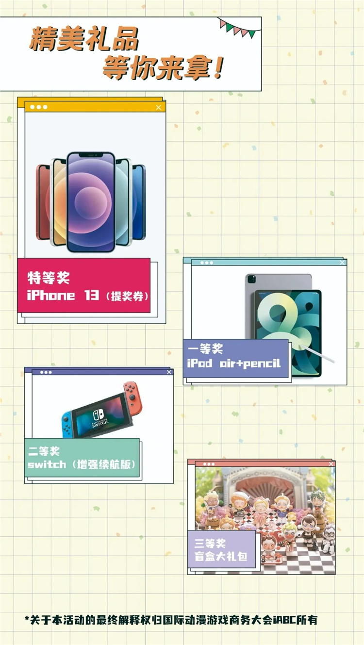 进入iABC GO官方小程序 完成每日签到, 现场完成打卡任务 就有机会赢取丰厚大礼👇 ⭐获得幸运值 每日签到、现场任务打卡均可获得幸运值。幸运值奖励可在iABC GO小程序【打卡】— 【当前幸运值】查看。 (一)打卡获得幸运值 1. 现场参与“1对1商务洽谈”:幸运值+30 规则:参会者通过iABC官方网站或iABC GO小程序提前预约商务会议,按照指定时间前往1对1商务洽谈区域,进门查验扫描证件即可完成任务。 2. 现场参与论坛活动三次:幸运值+30 规则:大会期间,参会者参与各主题论坛活动三次(每日刷新次数),进门查验扫描证件即可完成任务。 3. 现场拜访商务展台三个:幸运值+40 规则:大会期间,参会者拜访商务展台三个(每日刷新个数),通过iABC GO小程序-打卡-打卡扫一扫,扫描商务展台上二维码完成任务。 *在9月27日-29日活动期间,每日都可进行现场打卡。 (二) 签到获得幸运值 1.每人每天有1次签到机会,签到后即可获得对应的幸运值奖励; 2.每7天为一个周期; 3.若中断签到,则将默认累积签到归零,系统会自动开启新的签到周期。 ⭐兑换幸运值 在iABC活动期间,每100分可兑换1次抽奖机会,每日抽奖机会次数有限。 活动Day1:一次机会; 活动Day2:一次机会; 活动Day3:两次机会。 ⭐补充说明 1.幸运值高低不会影响抽奖概率。 2.幸运值不可转让他人,也不可进行交易,仅本人使用为有效,现场会进行核验。 3.关于本活动的最终解释权归伟德安卓版下载官网安装·国际动漫游戏商务大会iABC所有。 2021iABC 1.第十七届伟德安卓版下载官网安装·国际动漫游戏商务大会iABC即将于9月27日-29日在杭州举行。最新信息将第一时间进行更新和发布,请关注iABC官微及官网。 2.iABC证件注册通道,点击进入: http://iabc.cicaf.com/certificate/register *凭iABC证件可于专业观众日9月29日进入C端展会 3.日程安排(更新中)