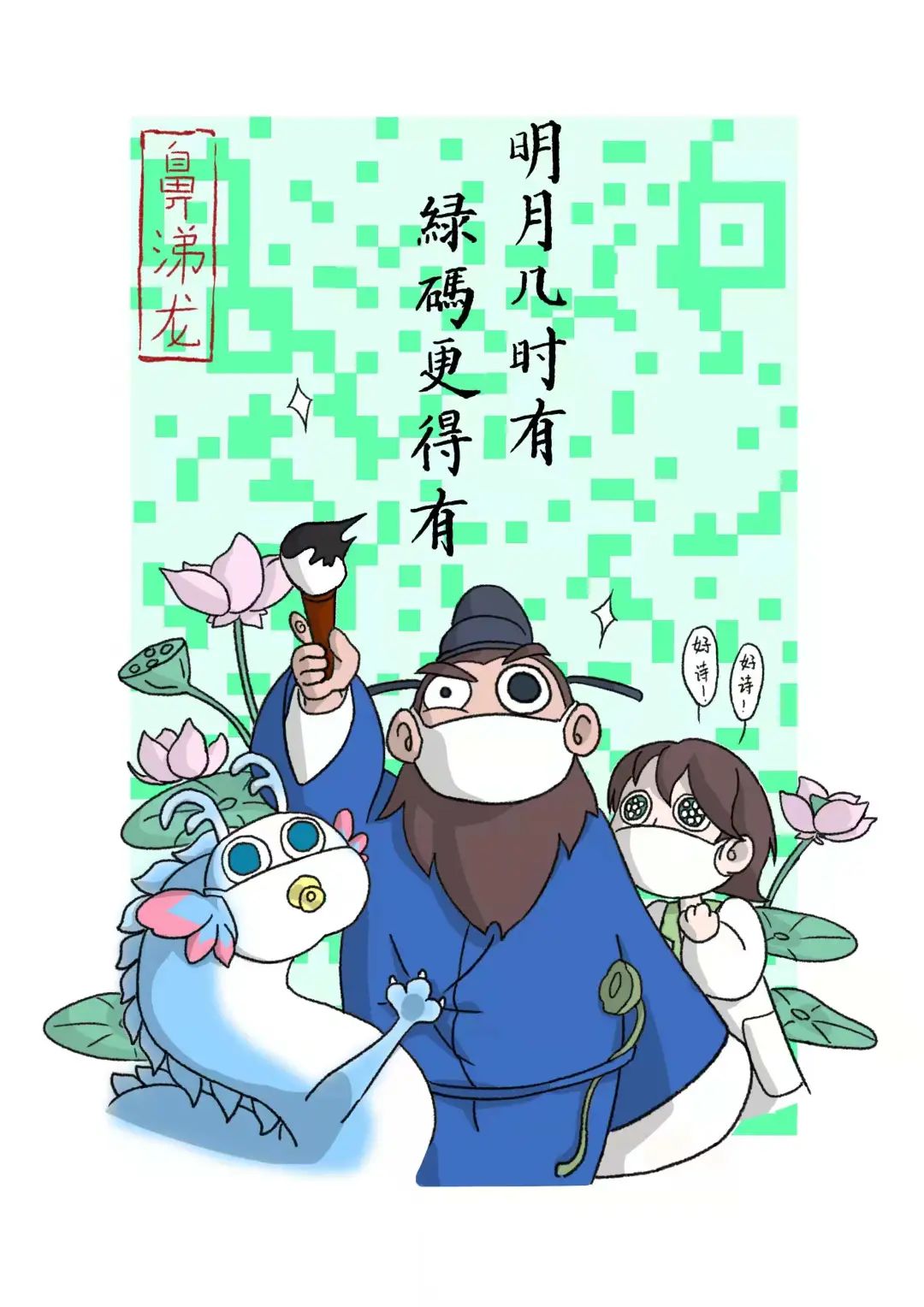 左右滑动查看更多图片 杭州当当动漫科技有限公司旗下作品 《鼻涕龙》中的IP形象们 “吟诗”为“绿码守卫战”加油: “明月几时有 绿码更得有”