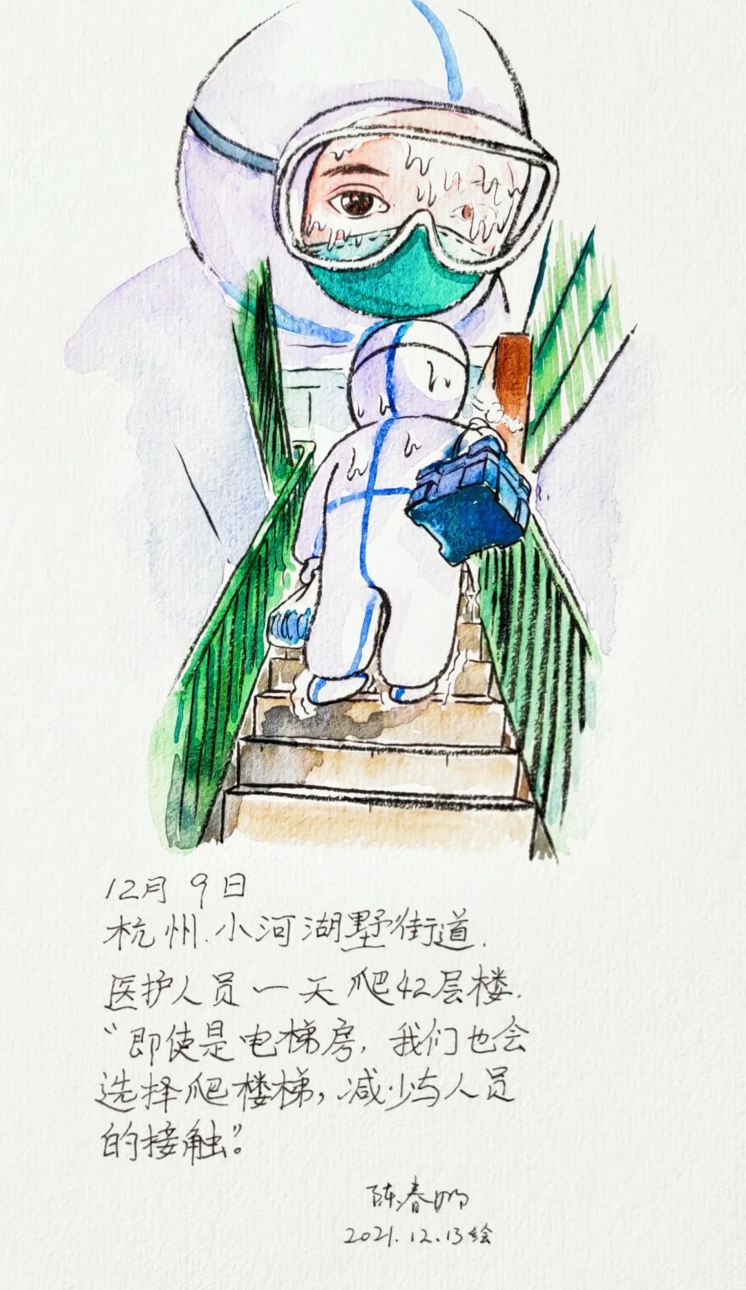 一线防疫人员日以继夜地辛勤工作, 筑起疫情防控坚固防线。 杭州自由插画师陈春娜用漫画记录下了 这些令人动容的画面👇