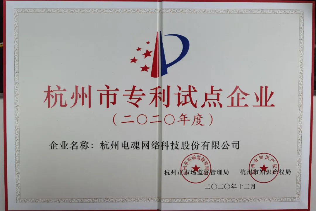 至今电魂网络荣获《杭州市专利试点企业》、《杭州市专利示范企业》双认证,是电魂网络进一步强化和提升知识产权管理水平的契机和新起点。电魂网络将始终保持一丝不苟的态度和创新进取的精神,在国家“知识产权强国建设”的政策指导下,继续积极发挥企业在知识产权工作的影响力,提高电魂网络在海内外市场的竞争力。