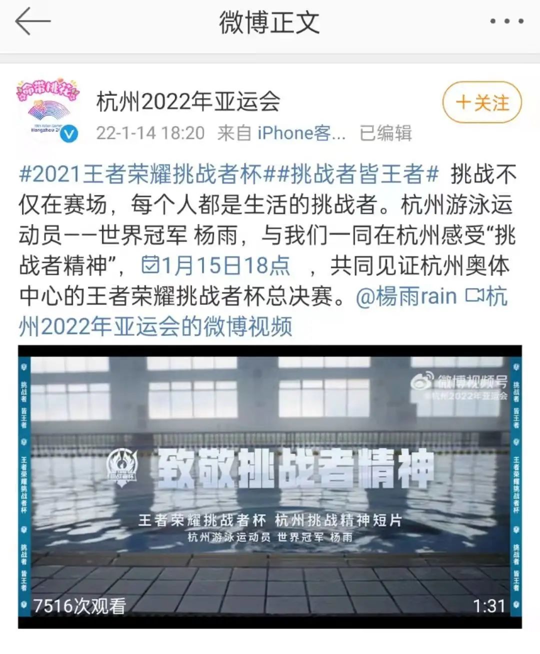 颁奖现场 赛前,杭州亚运会官方微博也为“挑战者们”擂鼓呐喊,并在1月14日发布了助威视频,杭州游泳运动员、世界冠军杨雨穿梭在杭州城市角落,微笑面对种种挑战,与王者荣耀电竞选手的挑战精神交相呼应,让体育赛事再次迸发出现代与传统的精神共鸣。