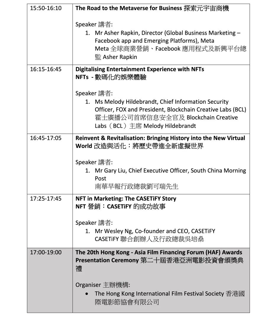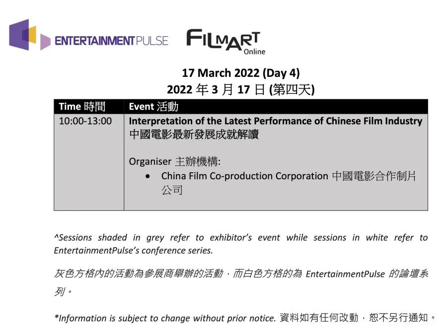 为带给行业工作者更多交流及合作机会,现面向影视动漫游戏全领域具有采购需求的行业人士进行招募,感兴趣的朋友可通过杭州馆注册成为2021年香港国际影视展买家,将免费参与以下论坛活动。 如何报名 报名信息:姓名+邮箱+公司+职位,发送至 收件邮箱:edward.shen@megamedia-china.com 报名费用:免费 截止时间:3月10日 与会者业务内容涵盖:电影、电视、动画、纪录片、数码娱乐/游戏、数码效果及音乐发行及制造公司、戏院商,无线电视/有线电视/收费电视及卫星广播公司,电台广播,网上平台,制作及后期制作服务,影视技术及器材,娱乐事业服务供应商,专利授权公司,电影节/电影展主办机构,行业协会,融资,娱乐事业专业服务等 2022 活动日程