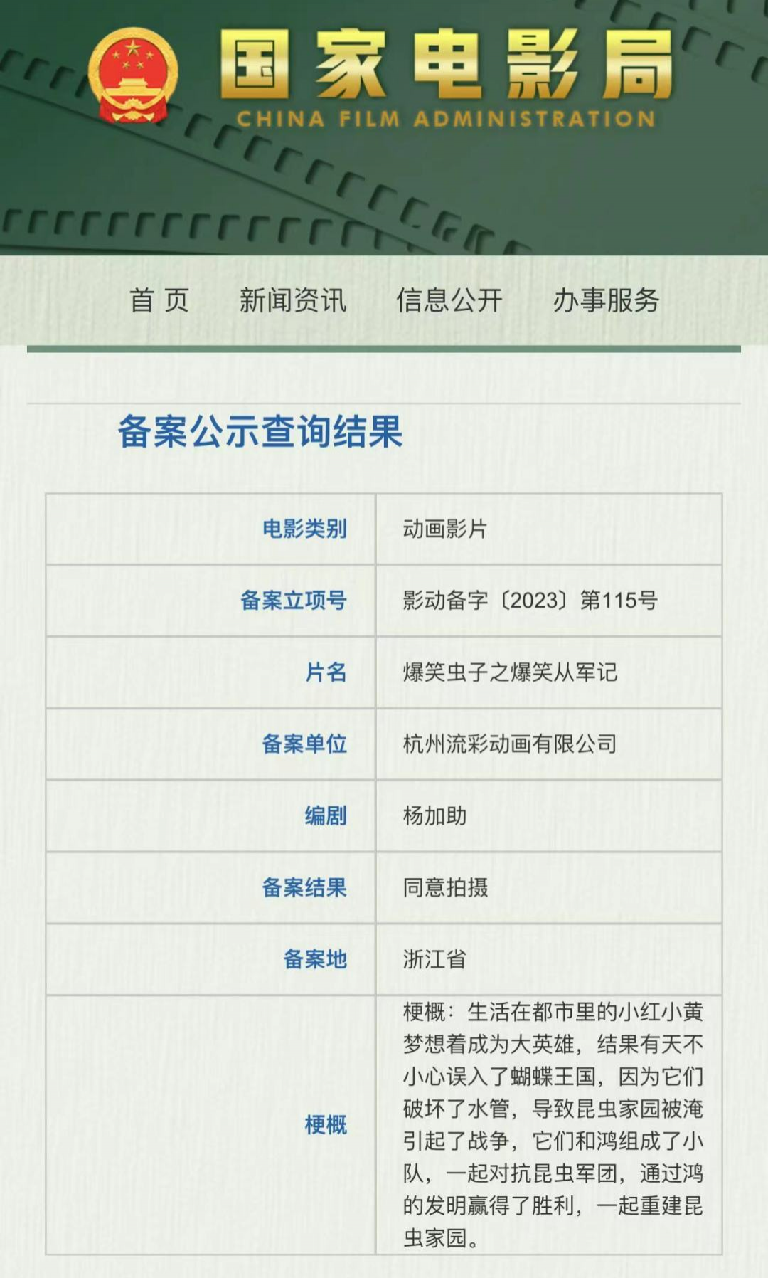| 近日,国家电影局发布了关于2023年11月止全国电影剧本(梗概)备案、立项公示的通知。 杨加助担任编剧的动画电影《爆笑虫子之爆笑从军记》电影版通过立项备案,同意开拍,备案单位:杭州流彩动画有限公司。