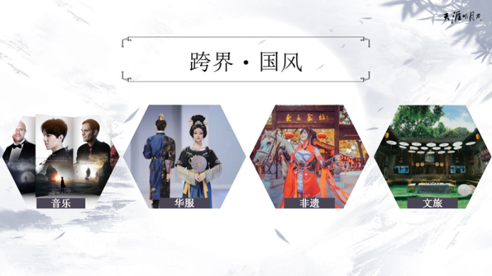 在音乐方面,2016年,“天刀”举行心时纪鸟巢国风音乐会,次年举行祈年纪国风公益音乐会,持续打造成国风音乐圈盛事。“天刀”原创音乐《醉花宗主》更是荣获好莱坞音乐传媒奖(HMMA)最佳时节音乐奖,代表其中的国风音乐元素获得了西方主流媒体的肯定。在华服方面,2018年和2019年,“天刀”依次登陆纽约、巴黎时装周,将华服推广海外,获得海外媒体热评,定制华服更是亮相华裳秀典国风时装秀,助力国风服饰推广。在非遗方面,多年来“天刀”成功将四大名绣、木版画、古筝、书法、云锦、花丝镶嵌、京剧等30余项非遗项目在游戏中真实还原,让年轻人跨时空体验感受非遗文化的无限魅力,助力非遗项目传承与发展。在文旅方面,成功完成“天刀+”大湘西合作三部曲、“天刀+”横店、“天刀+”开封、“天刀+”永定土楼等一系列国风主题文旅项目,与城市、景区共建国风特色名片。
