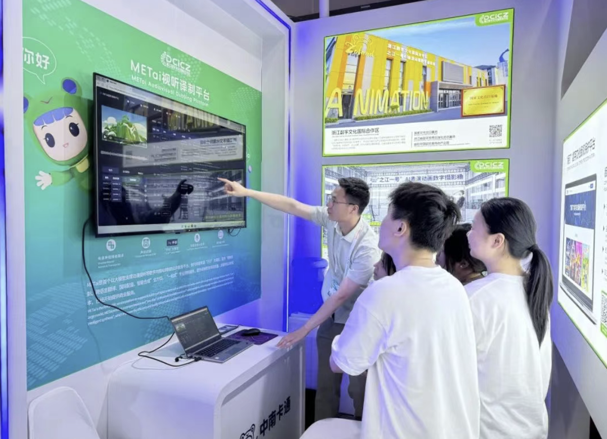 中南卡通展位围绕天眼开播二十周年,设有苏东坡、钱王传奇主题展区,观众既可以和苏东坡AI数字人展开穿越时空的对话,也可以和钱王COSER对弈、互动,参与非遗活字印刷体验等通关打卡互动。国家文化出口基地的METai视听译制平台也在现场进行展示体验,推动商务合作。这里也是“谷子”的世界,动漫爱好者可以与乐比悠悠、天眼、苏东坡、吐司豚等动漫IP周边衍生品“亲密接触”。