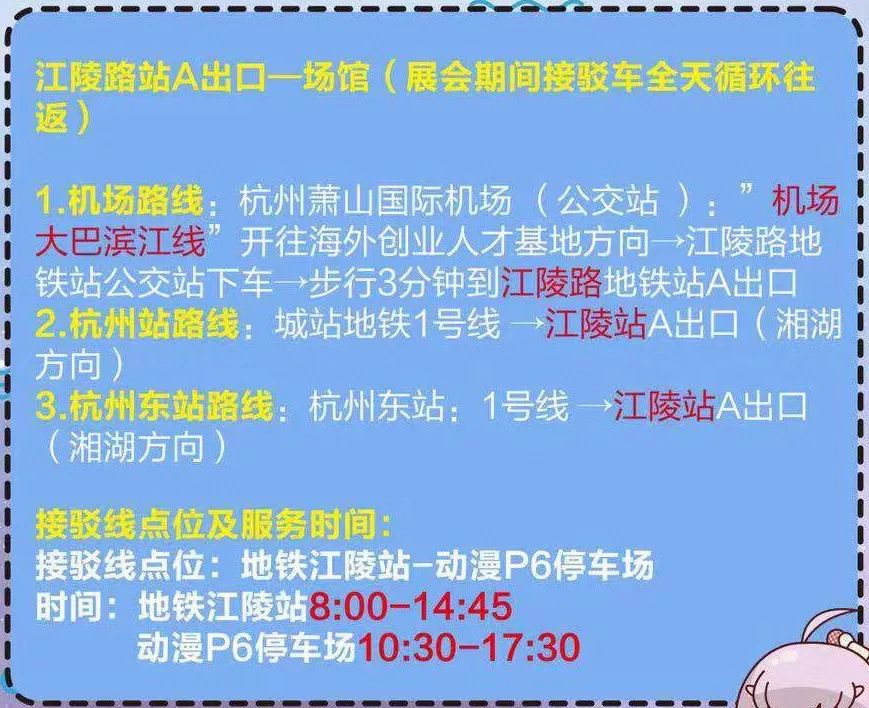 所以,欢迎你绿色出行,搭乘地铁来逛这个二次元的盛会,别担心地铁无法直达白马湖动漫广场,将会有接驳车恭候各位。在地铁1号线江陵路站A出口,接驳车全天循接,完美解决了大家最后一公里的路程。